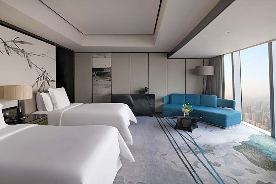 Signature room type with panoramic views of the city's iconic Canton Tower through floor-to-ceiling windows. The room features a luxurious, naturally lit full-marble bathroom featuring with an extra-large soaking tub and a walk-in rain shower.